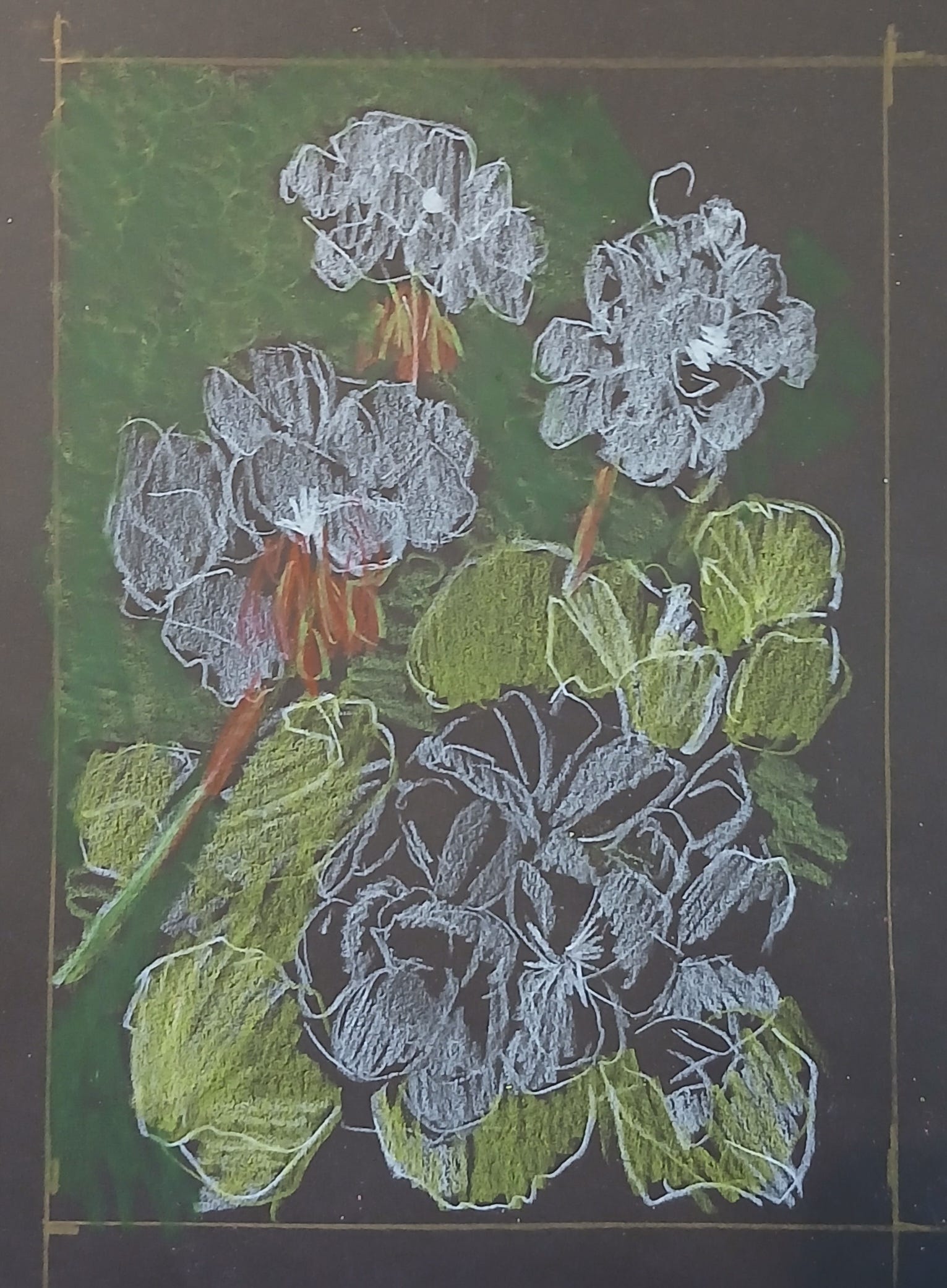 Once the general composition is made, it’s time to lay in some basic colors. If I want to have bright colors on dark paper, it helps to make a light layer of white or other light color to blend with the reds and oranges. I’m not so concerned about the green background, so it only requires a light layer, but I used a brighter green for the leaves of the geraniums.